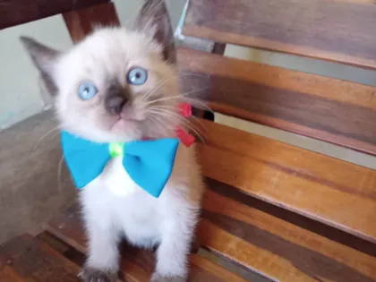 Olhos azuis, peludinho, raça siamês, come ração, usa cx de areia, muito dócil, macho, á procura de um lar com carinho