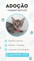 Possui três meses, está vacinado e vermifugado. É super dócil. Tem uma cicatriz no olho direito porque se machucou na época em que estava nas ruas, mas é super saudável, não é doença, apenas questão estética.