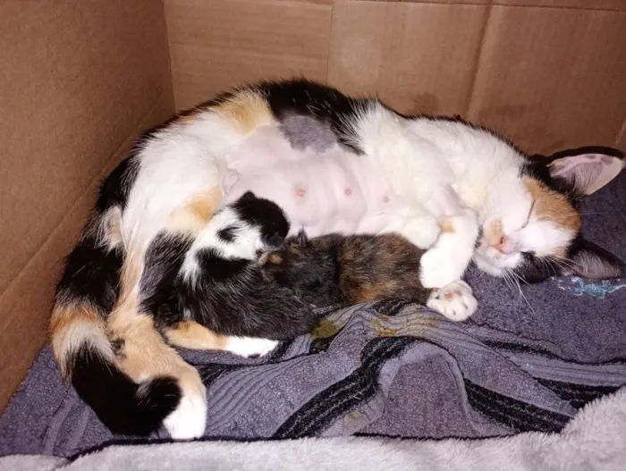 Os filhotes nasceram no dia 24 de março, então ainda falta um tempo, mas nós buscamos adoção para a mamãe e para os filhotes. Nós sabemos que a filhote escaminha é fêmea, mas o/a frajolinha nós ainda vamos ter que esperar um pouco para termos certeza do sexo.