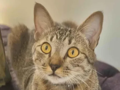 Ele tem menos de 2 anos, com pelagem rajada e porte médio.