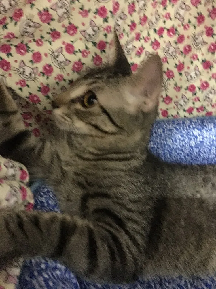 Filhote dócil, com 5 meses, castrado, FIV/FeLV negativo, vacinado e vermifugado. Nasceu no telhado de uma casa do Lago Norte, foi resgatado com seus dois irmãos pretos e uma irmã rajada, a única adotada até agora. Desde então vive em gaiola pois está a espera de alguém que o adote, que o ame mesmo sendo rajado, cor que muitos consideram comum.