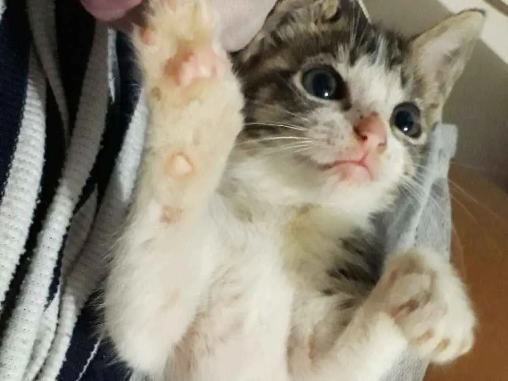 Nossos dois irmãozinhos foram adotados e nós duas ficamos, não fazemos ideia do motivo, somos inocentes, mas quem está cuidando da gente disse que é por causa da nossa pelagem. Uma é particolor de branco com rajado e a outra toda rajadinha. Nós, assim como os frajolas e as escaminhas, não temos a pelagem que o pessoal acha mais "atrativa" e tem vontade de adotar :(
