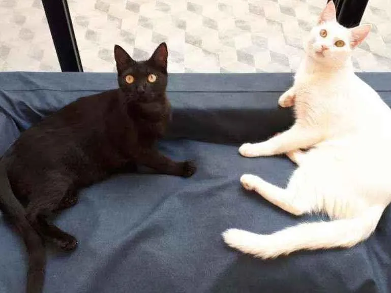 A pretinha é fêmea, se chama Zezé Mota e é doce e ronronenta. O branquinho é macho, se chama Rod Stewart e é sossegado. Os dois já estão castrados!