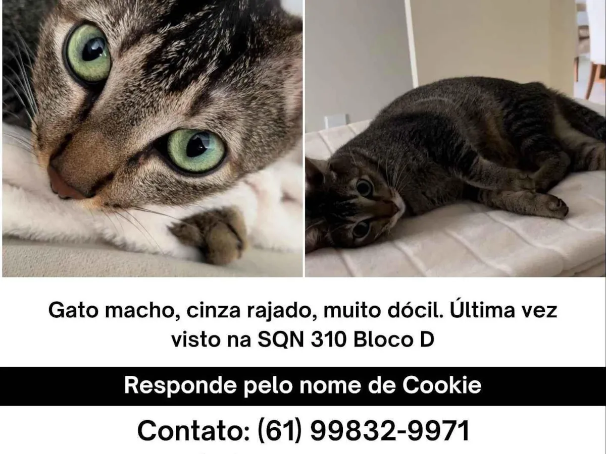 Ajude a encontrar o Cookie, um gato cinza rajado e muito dócil, perdido na SQN 310 Bloco A em Brasília. Sua ajuda pode fazer a diferença!