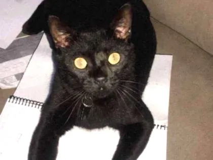 Ele é castrado, tem alguns pelinhos brancos espalhados no corpo, está usando coleira com um pingente azul no formato de osso.