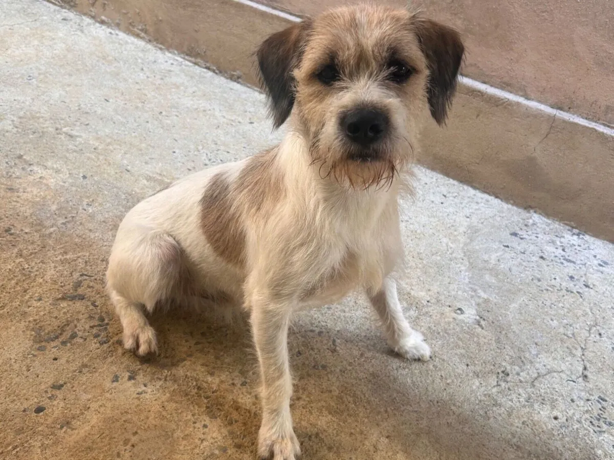 Billy, o SRD-ViraLata de pelagem branca, busca um lar. Com 1 ano, é dócil, brincalhão e se dá bem em casas com quintal. Adote seu novo amigo!
