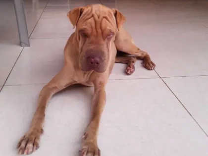 FOI ENCONTRADA DIA 04/01/2020 CADELA DÓCIL DE PORTE MEDIO COR CARAMELADA RAÇA SHAR PEI