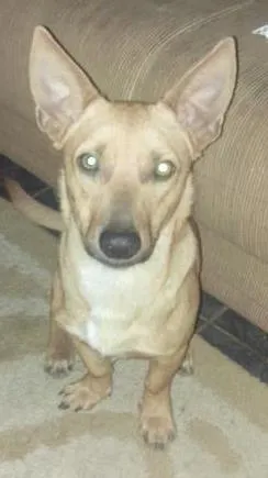 Adote o Chico, um adorável vira-lata macho de 1 ano em Goiânia. Pequeno, amarelo com mancha branca no pescoço. Dê uma nova chance a ele!