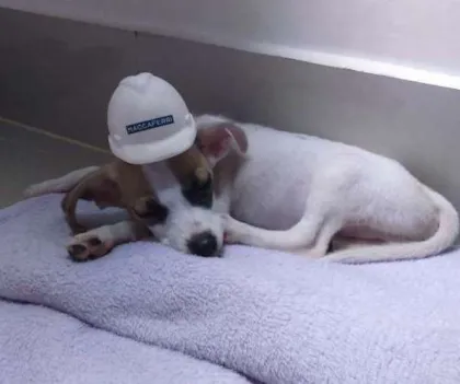 "Conheça o Quartzo, um lindo cachorrinho de 5 meses com pelagem branca e pintas marrons, que busca um lar amoroso em Goiânia. Adote e faça a diferença!"