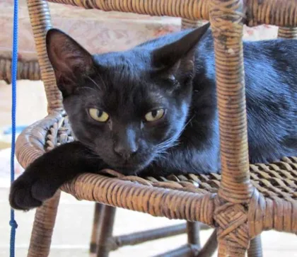 Mussum - Sou um gato negro de olhos verdes e de nariz arrebitado. Sou muito brincalhão. Adoro bolas, fitas, coisas que voam...