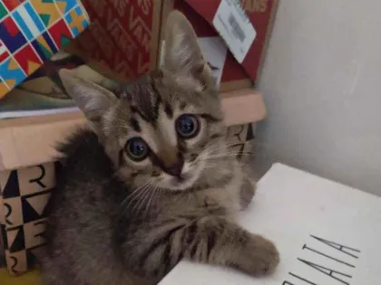 Adote o Bento, um filhote de gato de 2 meses, carinhoso e independente. Já come sozinho e usa a caixinha de areia. Levo até você!