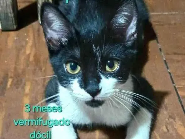 Adoção de gato Frajola, SRD, dócil e brincalhão. Procura um lar amoroso. Ajude a oferecer carinho a esse pequeno resgatado da rua. Adote e transforme vidas.