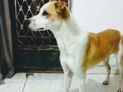 Puff é um cachorro branco e bege, brincalhão, mas não gosta de crianças. Procura um lar com espaço e amor após mudança para apartamento.