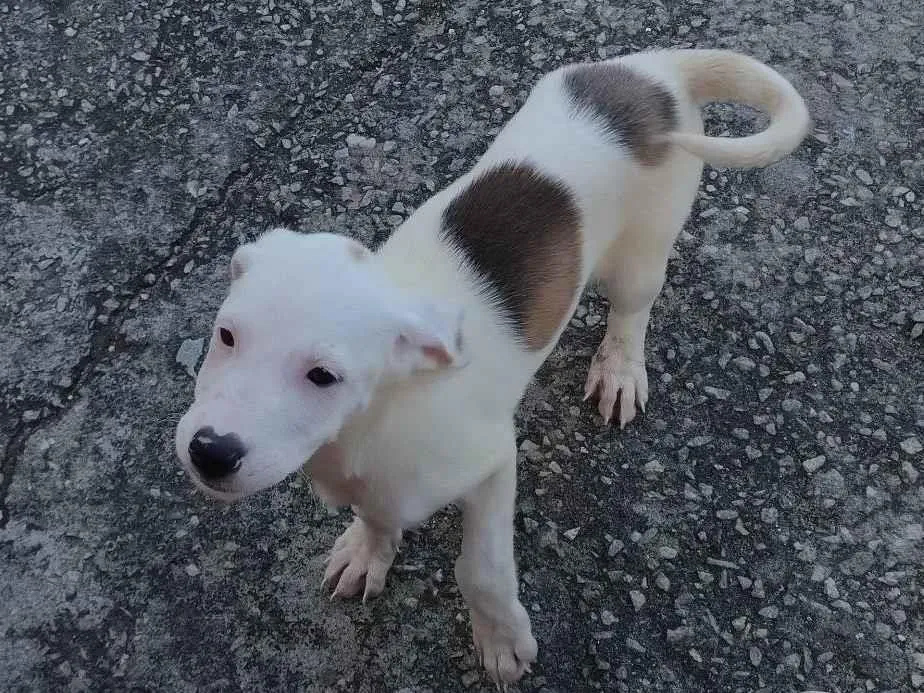 Adoção de Oreo, um filhote macho SRD de 3 meses, branco com manchas marrons. O amor de um novo amigo espera por você em Contagem, MG!