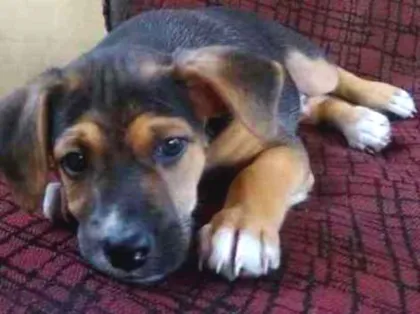 Conheça o Billy, um adorável vira-lata macho com menos de 2 meses. Bem cuidado e dócil, ele está aprendendo a comer ração. Adoção em Uberlândia/MG!