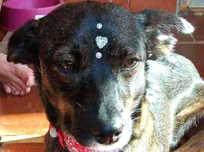 Uma cadela que tem semelhança na aparência de pastor porém de porte de médio para pequeno muito brincalhona e cheia de energia,bem carente ela pede para brincar