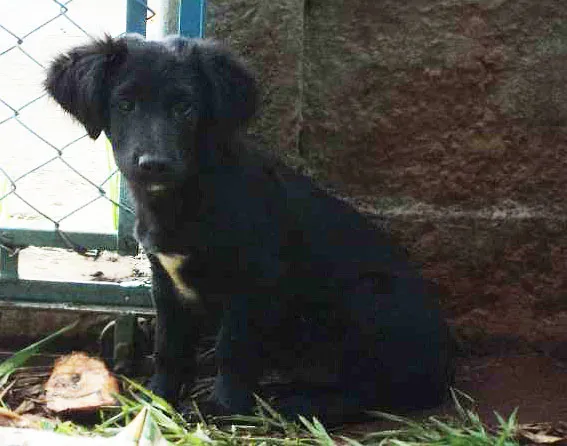Ele é um filhote de porte pequeno de aproximadamente uns 6 meses, é preto com uma listra branca no peito, aparentemente está saudável.