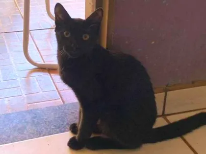 Gato preto de 1 ano, castrado e saudável, procura um lar carinhoso. Ideal para quem quer um companheiro dócil e leal. Adoção responsável.
