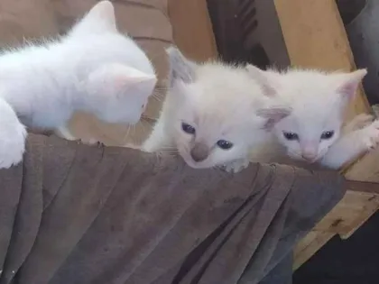 Adote lindos gatinhos branquinhos de olhos azuis! Eles são saudáveis, já comem ração e usam a caixa de areia. Faça uma adoção responsável e ajude!