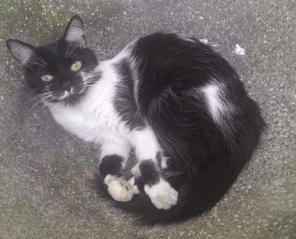 gata com as pernas traseiras fracas, não pula alto, tem medo de carros, adora um colo.