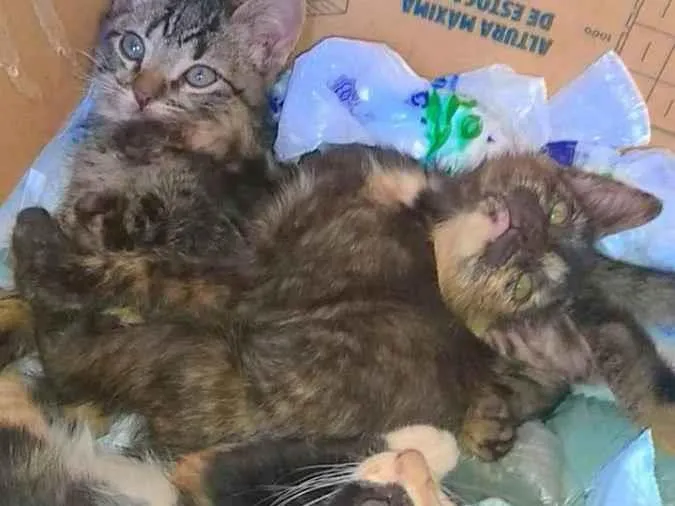 Três filhotes de gato para adoção, não vacinados e sem nome. Mãe também disponível. Ideal para quem busca companhia e amor felino.