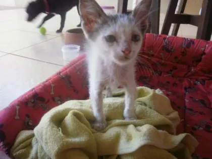 O gatinho apresenta uma pelagem branca com cinza, super dócil, come apenas ração. E esta precisando de muito carinho, pois apareceu na minha casa bem judiadinho.