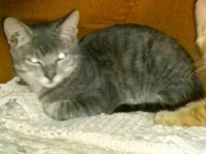 Meu gatinho TINHO é de médio porte, cinza com listras bem discretas, seu narizinho tem uma manchinha preta, seus olhos são amarelados.