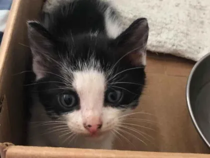Conheça a pequena Mom, uma gatinha de pelagem branca e preta, com menos de 2 meses e porte pequeno, em busca de um lar amoroso. Ela é um verdadeiro doce, com