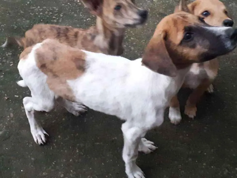 Cachorrinhos de 4 meses, tranquilos e de pequeno porte. Macho branco com marrom e fêmea marrom. Alimentados com ração, frutas e comida caseira.