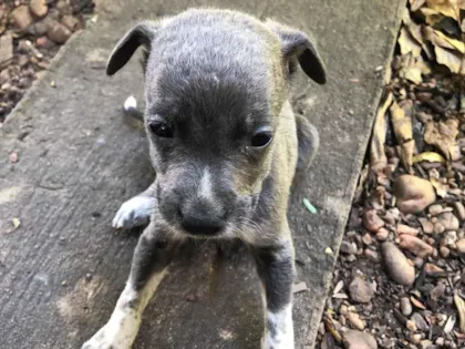 Adote um cãozinho SRD-ViraLata de pelagem cinza e porte pequeno, com idade entre 2 e 6 meses. Este filhote é um amor, com um temperamento dócil, calmo e