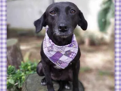 Tem o porte pequeno, deve ter uns 7 ou 8 anos, com energia de menina. Teve a vida, até aqui, marcada por coisas bem ruins, uma das marcas está em sua pele e não vamos tirar nunca. Ela foi quase degolada, não sabemos como e nem como foi salva. Passou por procedimento cirúrgico, teve os ovários separados do útero e tudo ficou lá dentro do seu abdômen e fez piometra. Como se não bastasse, carregava um TVT e sarna. Tudo numa guria com menos de 8 quilos.