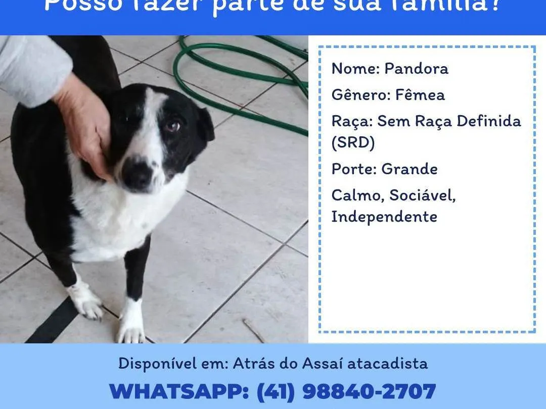 Adoção responsável de Pandora, linda cadela preta e branca, 4 anos, dócil e sociável, perfeita para famílias com quintal. Uma nova chance para ela.