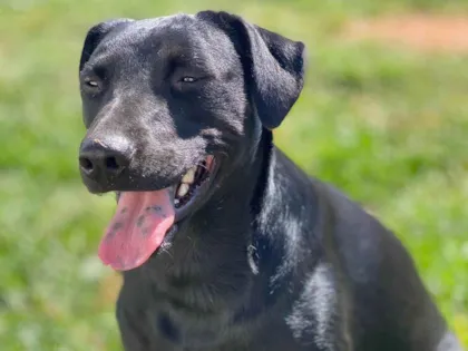 Bebê resgatada com sinomose está saudável, vacinada e castrada. Muito dócil, amorosa e obediente, pesa 22 kg e adora cheirar e investigar tudo.