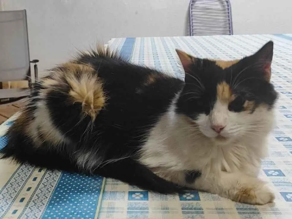 Gata tricolor, com aproximadamente 1 ano e meio que busca uma família
