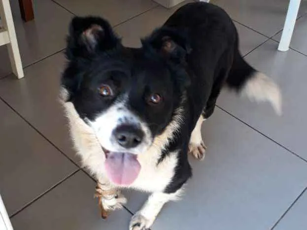 Ele é preto e branco.peludo e manca de uma pata.sofreu um acidente.muito dócil.