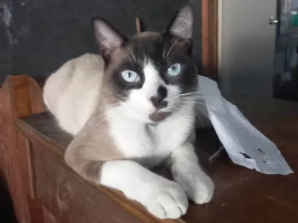 Gato de pelagem meio siamês, puxado para um cinza com preto, pinta preta no nariz puxando para a boca, estava sem coleira, desapareceu na vila garcia em frente a