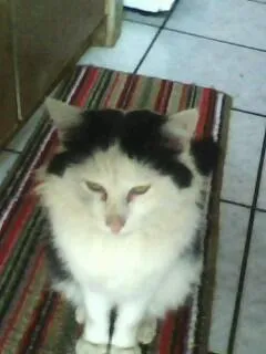 Gato tímido, com uma grande mancha preta em suas costas, e que tem duas manchas na cabeça que lembram uma peruca