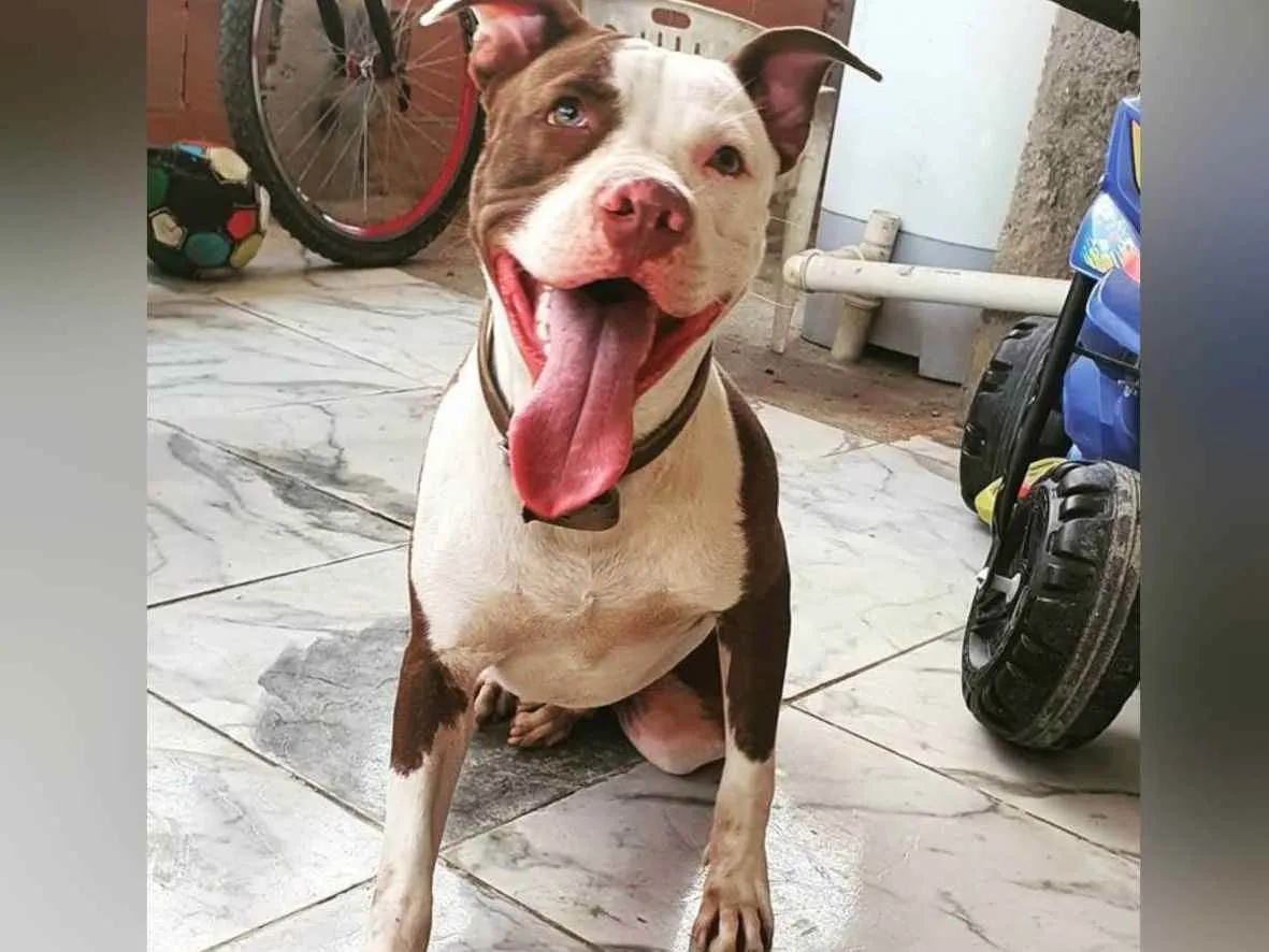 "Conheça o Fred, um pit bull amigável disponível para adoção em Belford Roxo, RJ. Perfeito para brincar com crianças! Adote amor!"