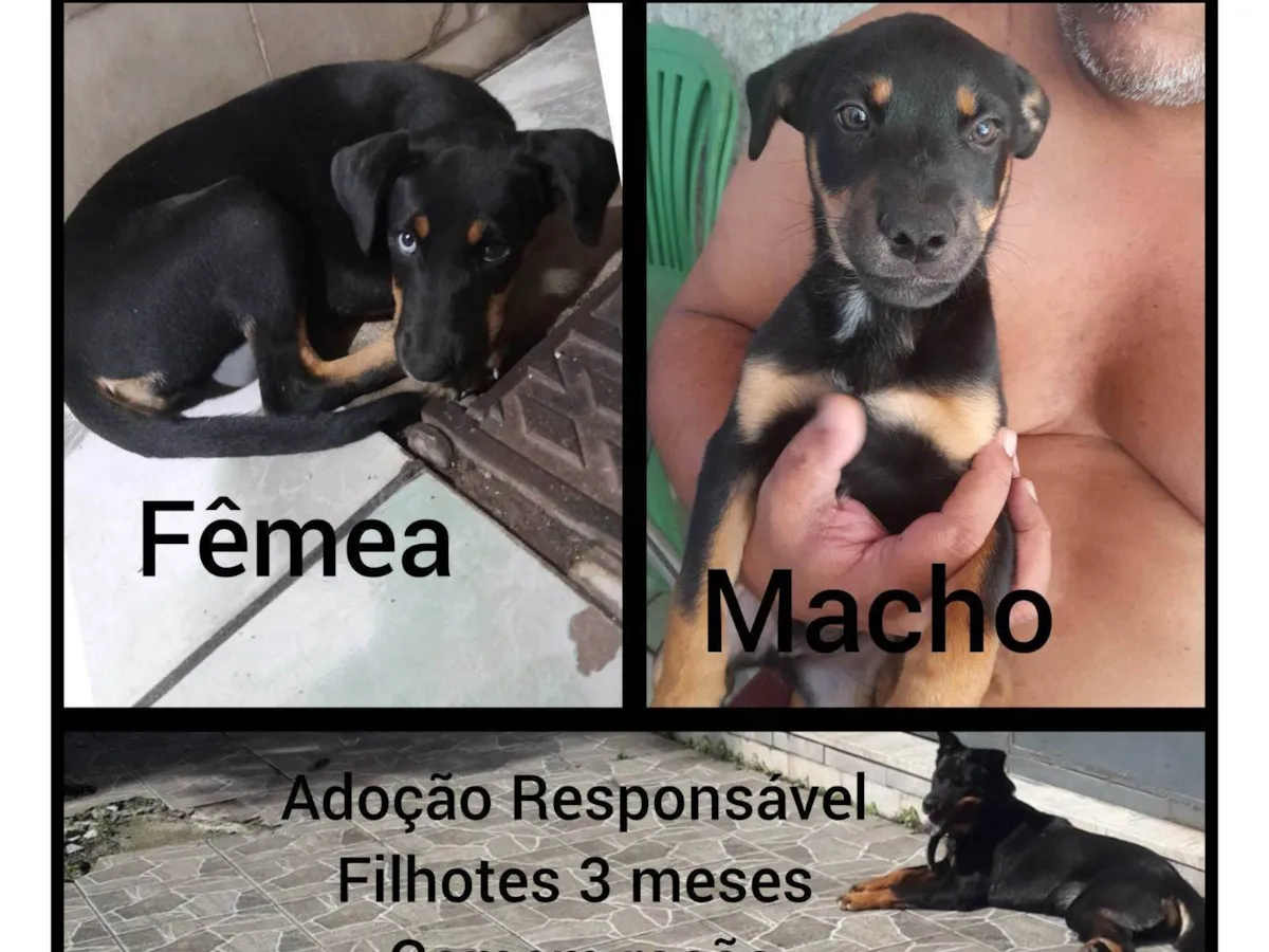 Adote um cachorro ou uma cadela em Duque de Caxias/RJ. Macho e fêmea com 3 meses, mistura de Rottweiler e Vira-Lata. Amam ração e carinho.