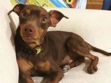 Ele e de porte pequeno e aparenta ser uma mistura de Fox Paulistinha e Pinscher.