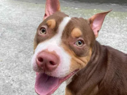 Adote Choco, o Pit-Bull marron de 1 ano. Dócil, brincalhão e sociável, ele é o companheiro ideal para famílias. Dê a ele um lar amoroso!