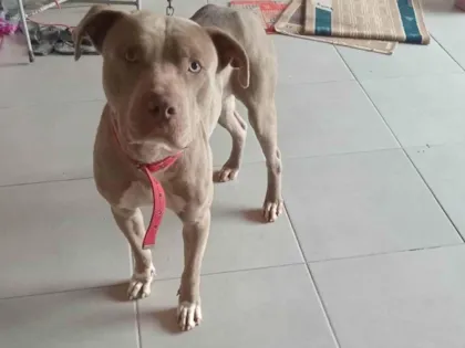 Adote Ingrid, um Pit-Bull cinza de 1 ano, vacinado e carente de amor. Ideal para família com quintal, dócil e bom com crianças e outros cães.