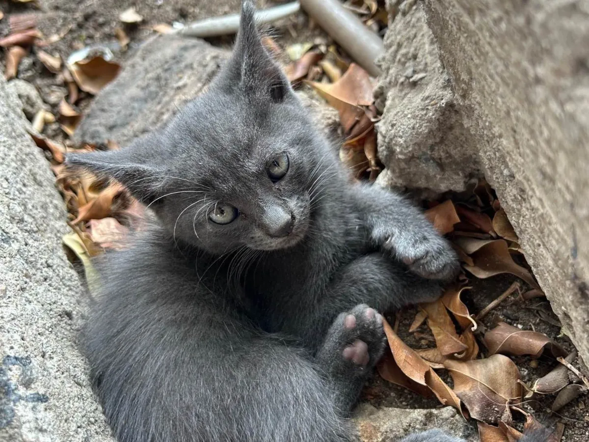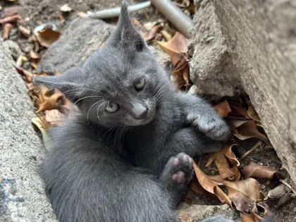Adoção de Aurora, adorável gatinha cinza de 2 meses no RJ. Ela já come ração e usa caixinha de areia. Dê um lar amoroso a essa fofura!