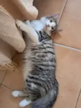 Conheça o Fábio, um adorável gato macho da raça SRD (Vira-Lata) com pelagem branca e cinza tigrado, bastante peludo, que está à procura de um lar amoroso! Com 5,5 meses de idade e porte pequeno, ele é o companheiro perfeito para qualquer família.