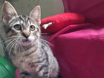 Adote a charmosa Magali, uma gata SRD de 2 a 6 meses, vacinada e vermifugada. Dócil e brincalhona, perfeita para apartamentos e para toda a família.