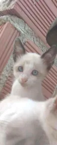 Estou doando três filhotes de gatos. São 2 machos e uma fêmea. Tem pelagem branca e bege.