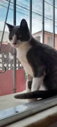 Gato cinza e branco, carinhoso e dengoso, busca lar seguro com telas. Castrado, vacinado e saudável. Ideal para companhia e amor incondicional.