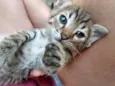 Já come ração e usa caixa de areia. Fica no colo tranquilo e adora um carinho.