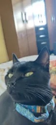 Yoruichi, gata preta de 1,5 ano, ex-mamãe, busca novo lar. Dócil e carinhosa, precisa de um cuidador que a ame e cuide dos filhotes. Adote!