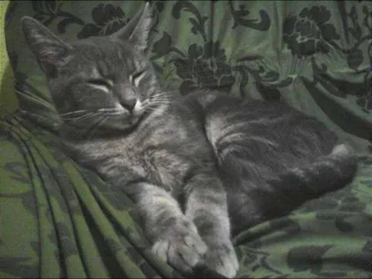 Gato cinza com olhos verdes e marcas de coleira encontrado em casa. Mole e dócil, parece ter sido de criança, fácil de segurar no colo.